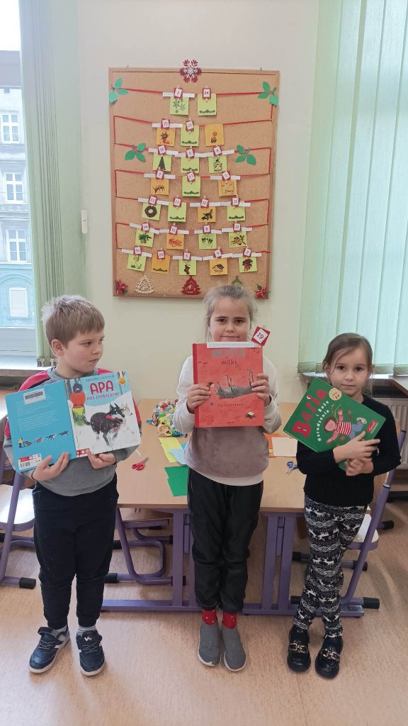 Biblioteka szkolna i świetlice klas I-VIII uczestniczyły w akcji czytelniczej” Biblioteczny kalendarz adwentowy” Akcja miała na celu przyciągniecie czytelników do biblioteki oraz przyjemne wprowadzenie w atmosferę świąt i przemycenie wartości edukacyjnych, między innymi informacyjnych( wyszukiwanie informacji), czytelniczych( czytanie książek), poznawanie tradycji świątecznych i historii swojej rodziny.