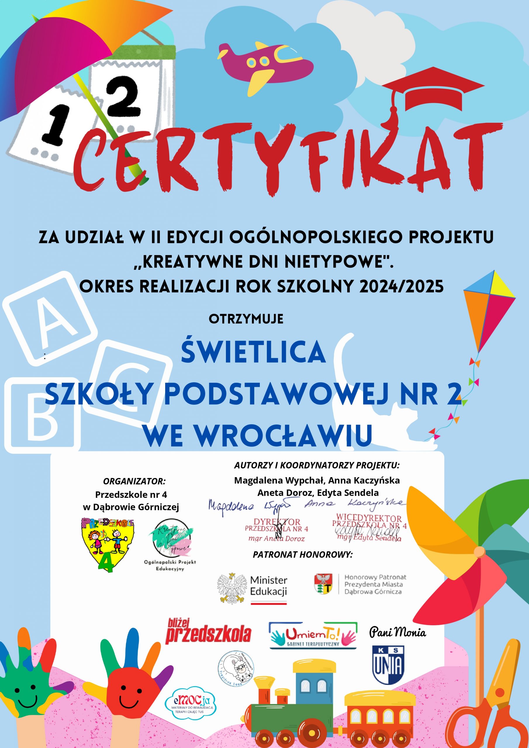 W roku szkolnym 2024/2025 nasza świetlica uczestniczyła w ogólnopolskim projekcie edukacyjnym o nazwie „Kreatywne Dni Nietypowe ”, którego najważniejszym celem był wszechstronny rozwój dzieci w różnym wieku poprzez stwarzanie sytuacji sprzyjających aktywizowaniu myślenia, rozwijaniu kreatywności oraz budowaniu poczucia własnej sprawczości.